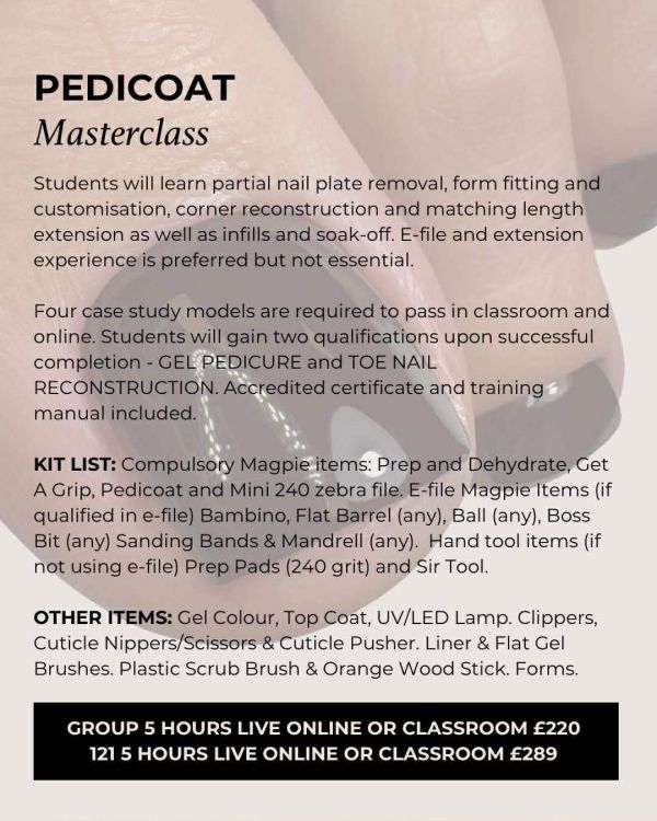 Correct maintenance and removal techniques are essential for nail health and long-term results, and these are taught in full during our accredited PEDICOAT pedicure gel masterclass training.